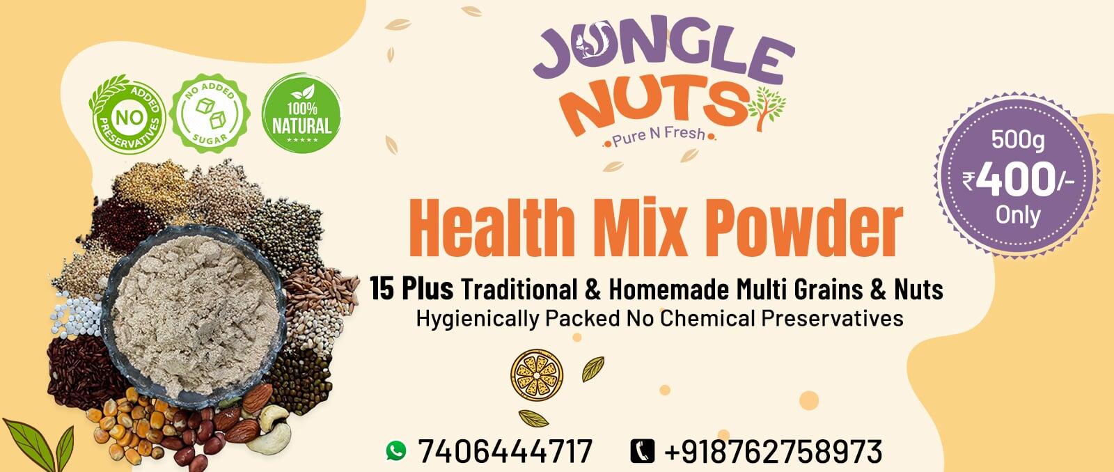 JUNGLE NUTS Health Mix is the best option for a daily meal that is rich in nutrients. This health mix, made with 15+ ingredients such as nuts, grains and pulses, is a powerful source of vitamins, minerals, and fiber that will improve your general health and energy level.